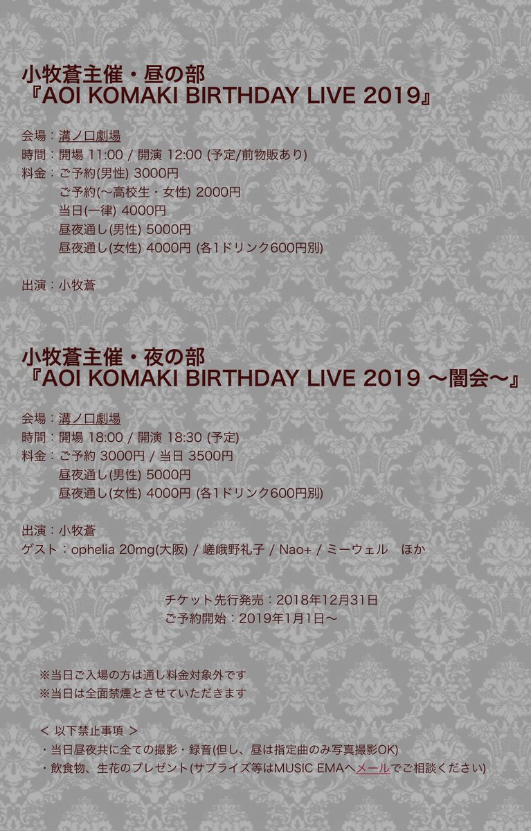 『AOI KOMAKI BIRTHDAY LIVE 2019』 開催日時:2019年5月12日(日) 開場 11:00 開演 12:00 会場:溝ノ口劇場 料金:予約(男性)3000円 予約(~高校生・女性)2000円 当日4000円 ドリンク代別 600円 チケット:http://musicema.thebase.in/ 予約:https://pro.form-mailer.jp/fms/59ea108b160149 出演:小牧蒼 |